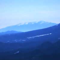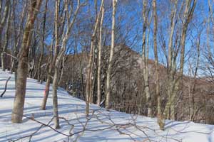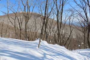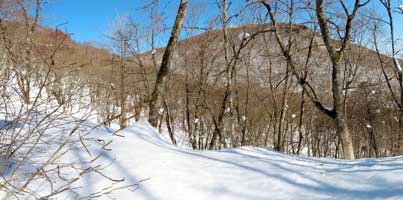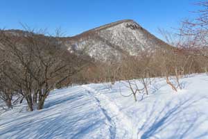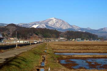 麓の根白石の里から端正な雪景色を魅せる泉ヶ岳 、 左(西)側から登るのが水神コースで緩やか、右(東)側から登るのが表コースで険しい
