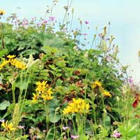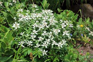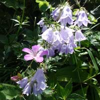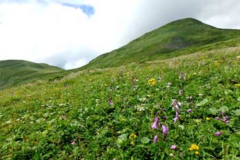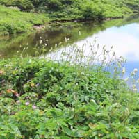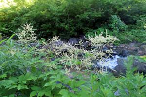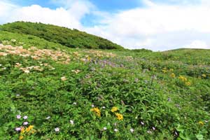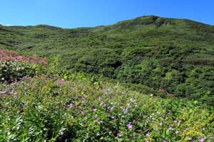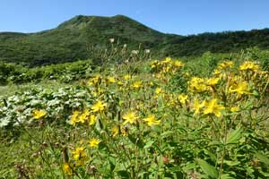 奥州市を西に走り県境を越え秋田県東成瀬村の林道に分入る。三合目登山口からブナ林を東に登る。概ね緩やか、よく整備されたトレイルは心地よい。六合目を越え小さく下って胆沢川を3回徒渉し、川に沿って緩やかに登る。やがて森を抜け展望が開ける。長命水で喉を潤し、青空に目的の焼石岳の山頂も姿を魅せる八合目から本格的な登りとなる。トレイル脇にはハクサンフウロやクガイソウ、タカネナデシコ等の花が咲き乱れる。ワンダフル。ゆっくりと花を愛でながら登る。九合目焼石神社から北斜面の岩場を登る。スライドした二人連れ山ガールと花の情報交換。ハクサンシャジンなどの花が咲く山頂でコーヒー休憩、南に下り姥石平を周回する。紫のコバギボウシと黄色いトウゲブキが魅せる補色のコントラスが麗しい。一昨年、雪解けの6月にはハクサンイチゲとミヤマシオガマのお花畑だった。夏の花園も素晴らしい。周回路の東側で山ガールに再会、南本内岳を巡って来た様だ。長野の安曇野と伊那市に在住、昨日は蔵王、明日は秋田駒、仲良し夏山ツアー、頼もしい。山談義と故郷談議に花が咲く。九合目分岐から南本内岳に向う。緩やかな頂きを踏み、折返した中腹の南本内川源流の沼辺でゆったり昼餉。ハクサンフウロ、クガイソウ、オニシモツケ、ハクサンシャジン、トウゲブキ、シロバナトウウチソウ、可憐な花が溢れる。天上の夏の花園、魅惑の夏山。夢の中。 |