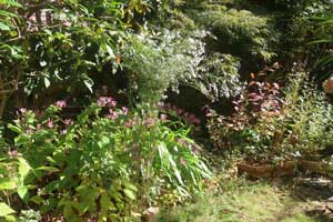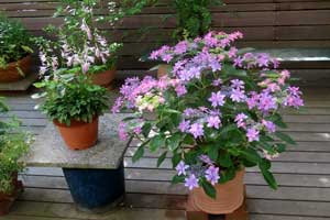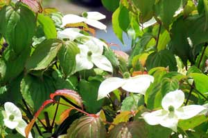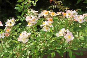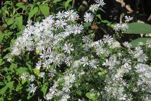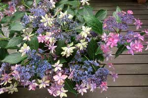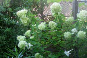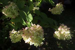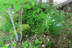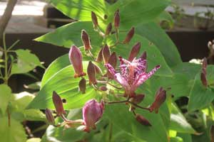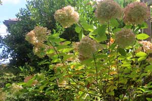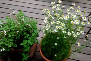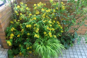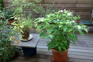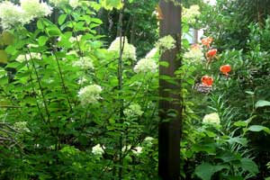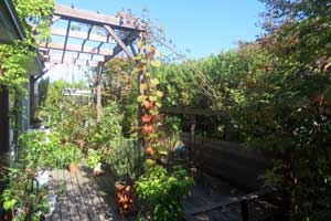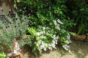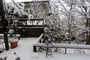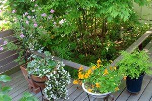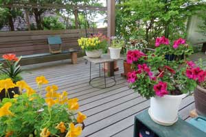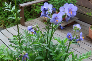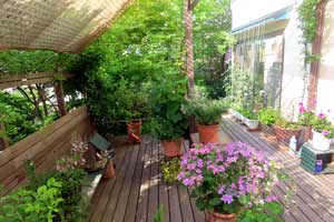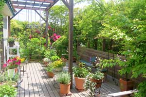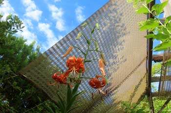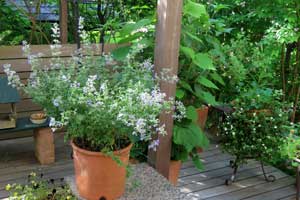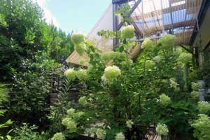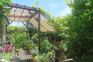 東北南部は6月14日梅雨入り、7月18日昨年より14日、平年より8日早く梅雨明け、短い空梅雨であった。6月から8月の平均気温は平年より3℃ほど高い暑い夏。仙台の猛暑日は8月末時点で8日/年となり記録を更新。我が家の小さなガーデン、ウッドデッキのパーゴラの可動シェードを広げ、手摺との間に斜めに固定シェードを張り日除け、木漏れ陽が心地よい。加えて強い陽射しの株元には寒冷紗や簾でスポット日除けし、こまめな水遣りで夏を乗り切る。 |